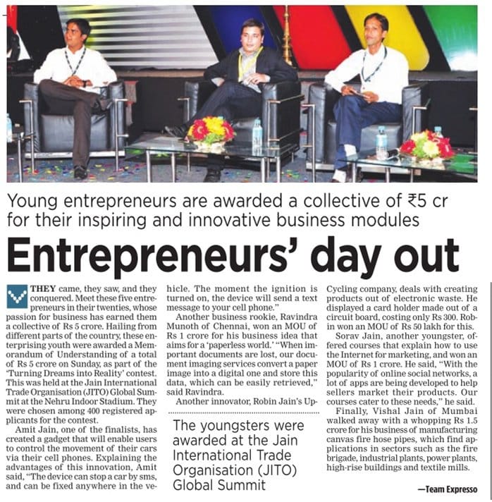 Coverage on echoVME winning the JITO Business Plan Competition (Indian Express, Chennai)